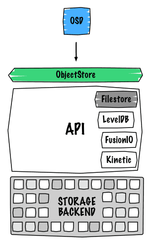 Currently, OSDs have a generic interface called ObjectStore, the only and default current implementation is called FileStore. The FileStore is a logical entity from Ceph that is responsible for the OSD data. In a nutshell, objects are being written as files on a filesystem. Generally, this happens under the /var/lib/ceph/osd/<osd-id>/current/<pg-num>/ directory. Any filesystem layer brings some overhead and this is definitely a huge area for improvement. I would even say that is probably one of the last obvious bottleneck of distributed storage system.
