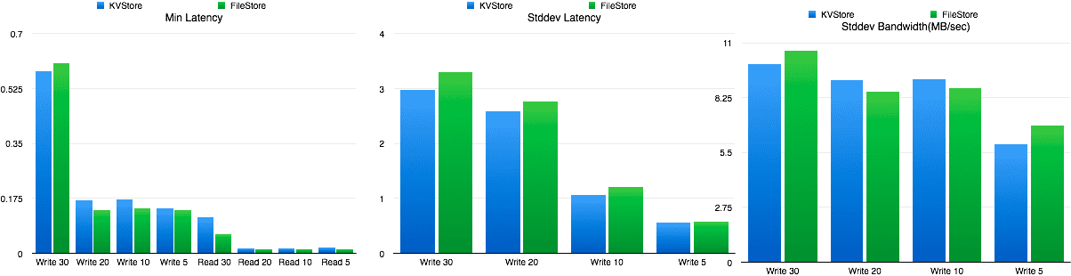 Overall performance are higher than FileStore, it is not that a huge difference but keep in mind that it is currently a prototype.