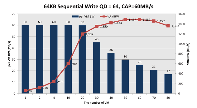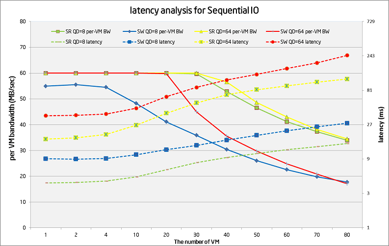 - For QD=8 cases, the read latency starts from 4ms and ends with 15ms. The write latency starts from 9ms and ends with 28ms. Further study shows the physical IO pattern becomes more random w/ a higher VM number, which is reasonable.