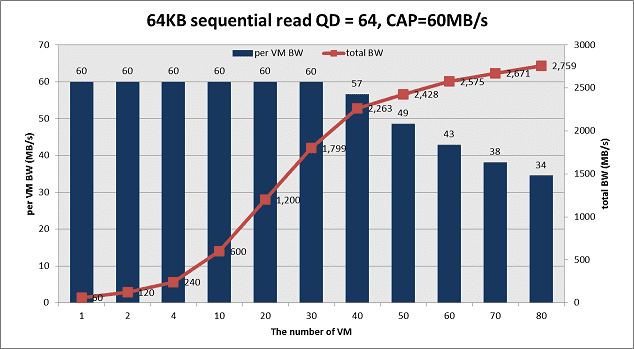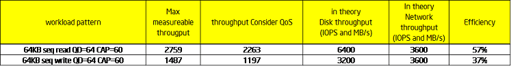 This is the 2nd post about Ceph RBD performance. In part1, we go talk about random IO perforamnce on Ceph. This time we share the sequential read/write testing data. In case you forget our hardware configurations, we use 40x 1TB SATA disks for data disk plus 12 SSD as journal. And 4x 10Gb links are used to connect the storage clusters with clients together, which provides enough network bandwidth. Below figures show the SR and SW performance with QD=64 and CAP=60MB/s per VM. With the number of Volume/VM increases, the per-VM throughput drops gradually. The SR max total throughput 2759MB/sec happens at VM=80 and SW peak total throughput 1487MB/sec happens at VM=50. However consider our pre-defined QoS requirement (Per-VM throughput is larger than 90% of the pre-defined target), we pick up VM=40 for SR and VM=30 for SW, which results in reported metrics as 2263MB/sec (SR) and 1197MB/sec (SW).