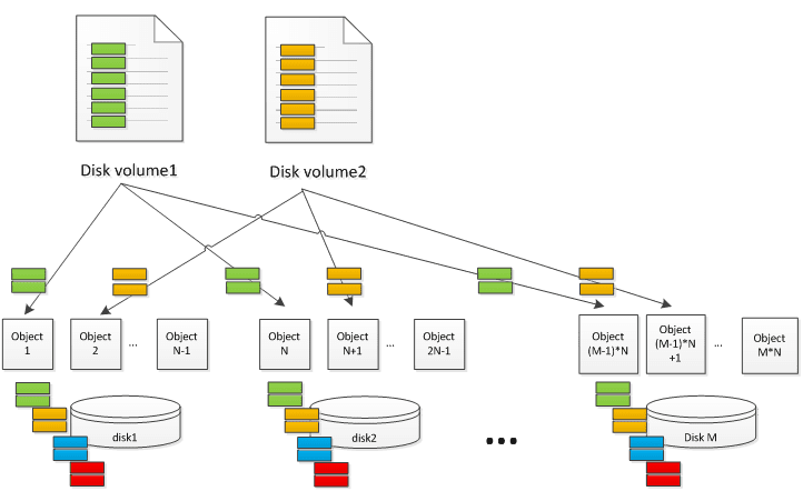 Let’s take a look at Ceph architecture to understand the data better. Below figure illustrates a conceptual Ceph cluster, which has M disks and each disk is mapped with N-1 objects. The size of volume disk is marked as Volume_Size. Assuming the object size is Size_O, each virtual disk volume is composed of Volume_Size/Size_O objects. To simplify the problem, some components (e.g. PG and replica impact) are ignored on purpose. The IO requests from virtual disk volumes are distributed to different objects based on CRUSH algorithm and become the real read/write hit on disks. Due to several objects map to the same physical disks, the original logical sequential IO streams mix together (green, orange, blue and read blocks). And the real IO pattern on each physical disk becomes random with disk seeking happen. As the result, latency becomes much longer and total throughput drops a lot.