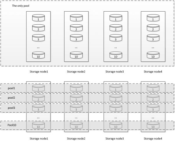 - The 2nd way is to change the IO pattern thus there is a higher adjacent IO percent with less seeking happens. There are two cases where the logical sequential IO stream is interrupted: The 1st one is the when the logical address of the same volume increases, the mapping object moves from one object to the other object (either on the same physical storage node or a different one). The 2nd case is that it is interrupted by other IO read/write to the same hard disk but from a different volume. Accordingly, we can also try two tuning methods. The 1st is to use bigger object size – thus the possibility of jumping to a different objects/nodes becomes less. And the 2nd one is to use better mapping rules. By default, we put all the disks into the same pool. Thus the virtual address space from one virtual volume is also distributed to all the physical disks. In this case, there are many IO streams from different volumes hit the same hard disk, resulting in a higher fragmented access pattern. The better way is to create multiple pools. Each pool has limited disks and serves less volumes. Thus there are fewer IO streams share the same hard disks, resulting in a better sequential pattern. Below figure demonstrates the two configurations. The idea is from the best paper “Copysets: Reducing the Frequency of Data Loss in Cloud Storage” in ATC 2013. The author’s original goal is to reduce the disk lost impact, which is valid for Ceph case. We suggest we may consider to keep this as “best practice” and add some function into Ceph to ease administrator’s work.