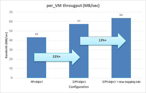 We did some tests to verify the two tuning options as below figure. The left bar (4MB object) is the default configuration with 4MB object size and one pool for all disks. The 2nd bar (32MB object) is the 32MB object size with the one pool for all disks. And the rightest bar (32MB object + new mapping rule) is the 32MB object size and 10pool with 4 disks each. With 40VM/volume and same pressure load, the average per-VM bandwidth is increased from 43MB/sec to 57MB/sec (33% gain) and 64MB/sec (13% gain). This seems to be a pretty good start. For next step, we will continue to try different tuning parameters to understand the tradeoff and identify the optimization opportunity to achieve a high sequential throughput. For example, Sage Weil from Inktank suggest we should turn on the RBD client cache, which is expected to increase the read/write package size, thus reduce the latency of each IO.