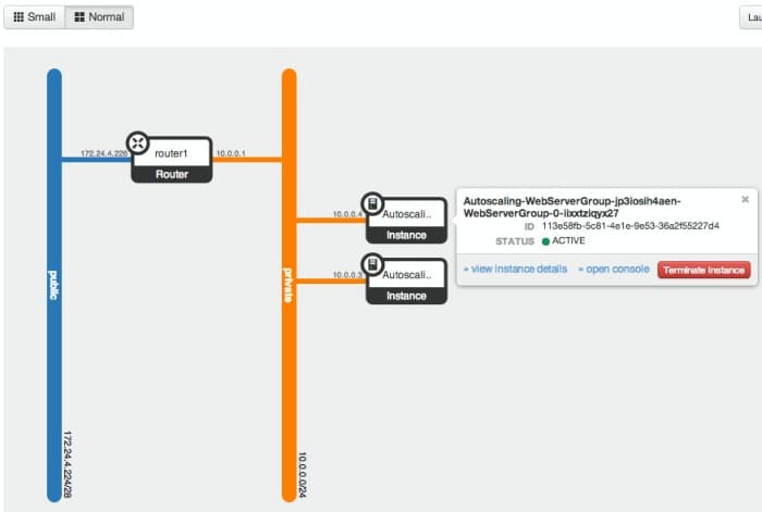 The network topology panel also had a nice re-looking. We now have 2 differents views (small and normal), depends on the number of instances you run. Another cool thing is that you can directly interact with the VM from the network topology panel and for instance request a termination or the console.