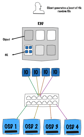 The picture above takes the common case of a RBD block device either mapped on a physical host or inside a virtual machine. The behavior remains the same so we don't need to separate both cases. In the situation, a client generates a lot of random operations with 4K blocks. Obviously, each OSD represents a hard drive disk.