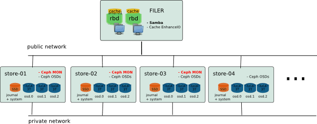 The idea was to create a storage with two parts: the storage itself (backing store) and a large cache to keep good performance on all data actually used. In fact, the volume needs may be important, but in the context of use for office, the data really used every day is only a portion of this storage. In my case, I intend to use Ceph deployed on low-cost hardware to ensure a scalable and reliable conformatble volume, based on small servers with large SATA drives. Data access will be via Samba shares on a slightly more powerful machine with an SAS Array to create a big cache. (Since Firefly, it would be more interesting to use ceph cache tiering)