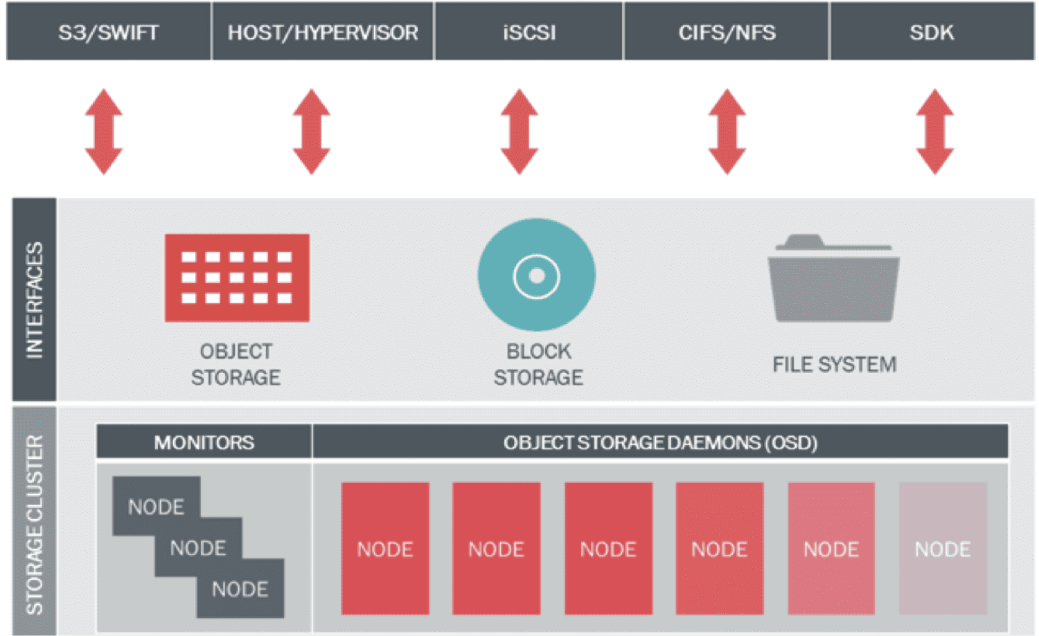 The sole of ceph storage cluster is RADOS ( Reliable Autonomic Distributed Object Store ). Ceph uses powerful CRUSH ( Controlled Replication Under Scalable Hashing ) algorithm for optimize data placement , self managing and self healing. The RESTful interface is provided by Ceph Object Gateway (RGW) aks Rados GateWay and virtual disks are provisioned by Ceph Block Device (RBD)