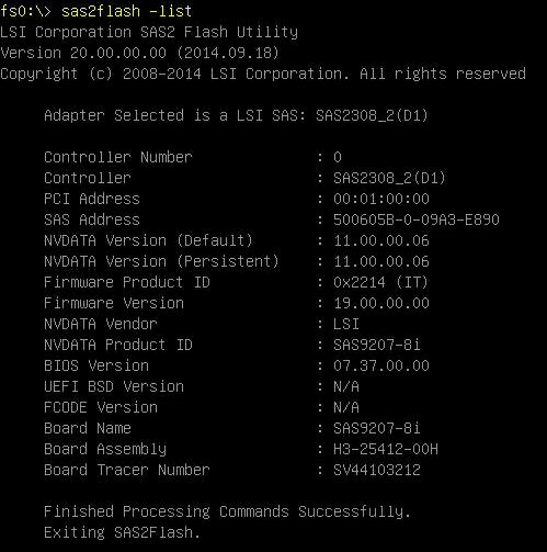 Before starting to flash, verify your card with sas2flash -list. If you have more than one controler you can specify the controler with -c controler_id for the next commands.