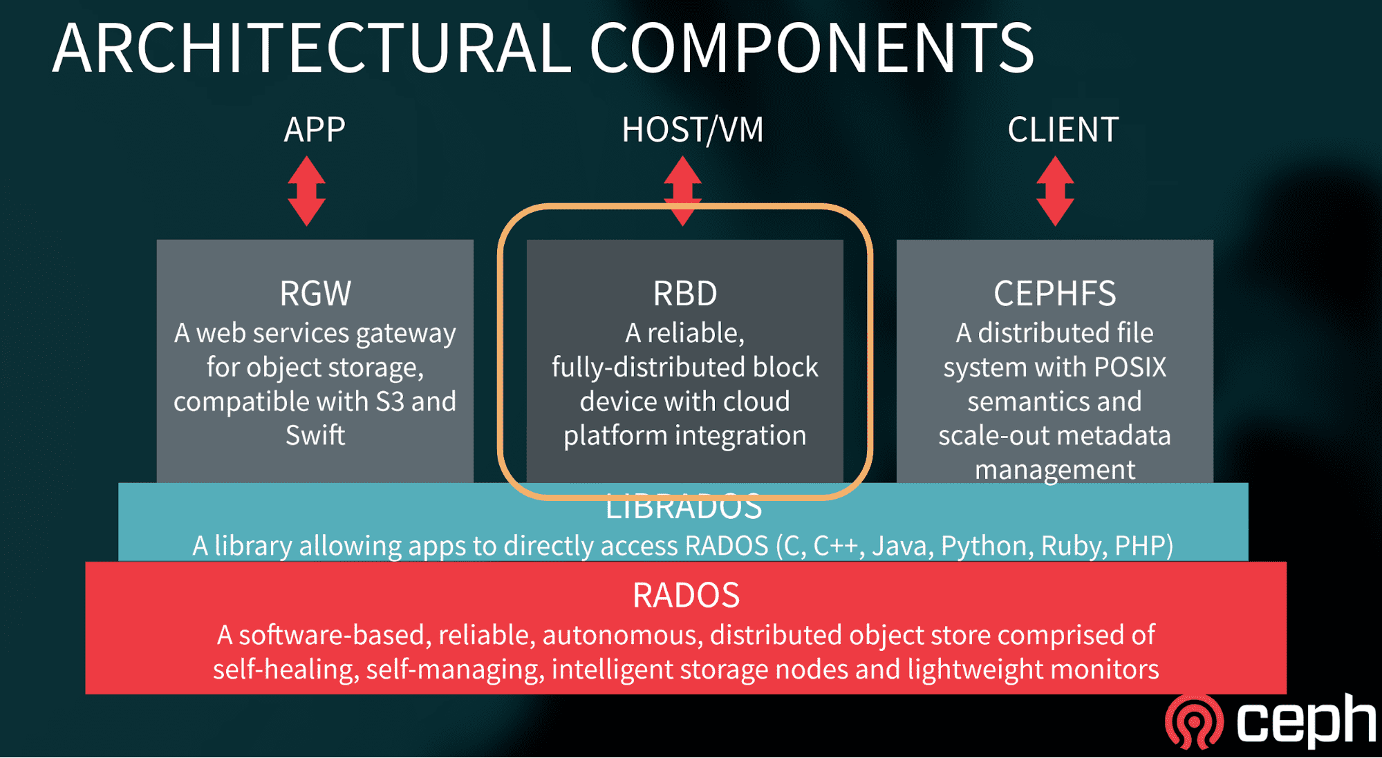 High performance and latency sensitive workloads often consume storage via the block device interface. Ceph delivers block storage to clients with the help of RBD, a librbd library which is a thin layer that sits on top of rados (Figure-1) taking advantage of all the features rados has to offer. RBD block devices are highly distributed in nature as it stripes a block device image over multiple objects in the Red Hat Ceph Storage cluster, where each object gets mapped to a placement group and distributed, and the placement groups are spread across separate Ceph OSDs throughout the cluster, this greatly enhances the parallelism when accessing data from and RBD volume.