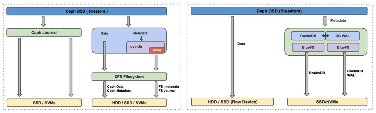 - The introduction of BlueStore as new storage backed for OSD. Starting RHCS 3.2, BlueStore feature is GA. BlueStore provides massive performance gains over the old FileStore backend by simplifying the IO datapath and avoiding double write penalties.