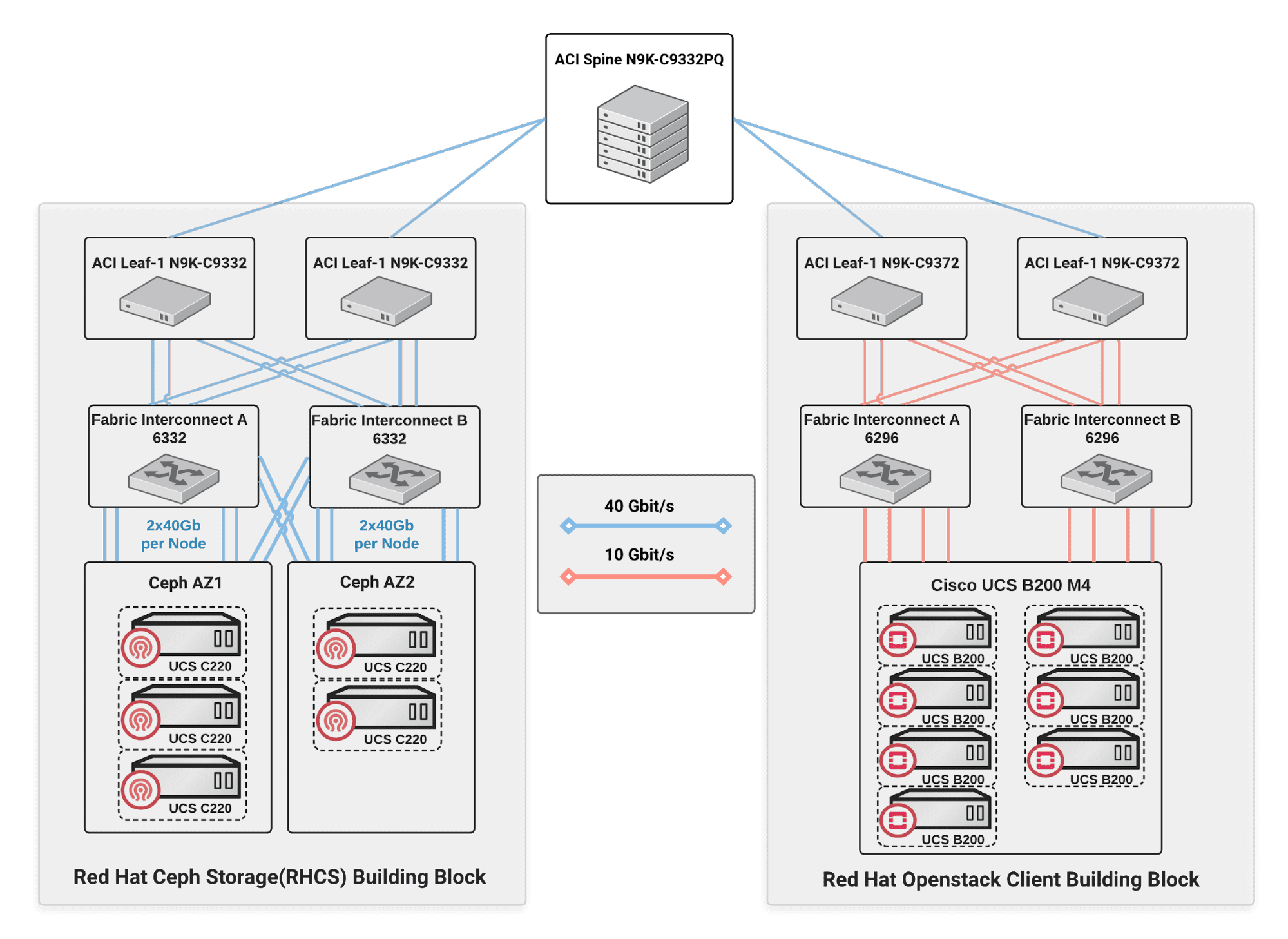 The lab environment was deployed with an ACI leaf and spine topology and both the public network and the cluster network are configured to use jumbo frames with the MTU size of 9000.
