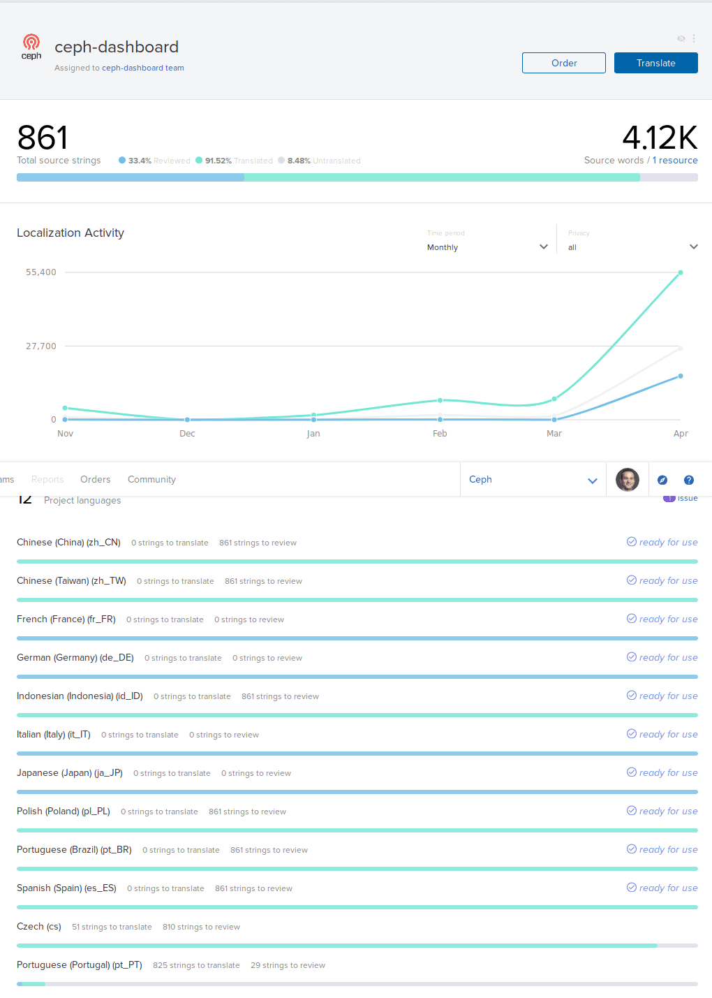 The dashboard’s web interface has been translated into a variety of languages that you can choose from. This hopefully makes it easier for Ceph users in non-English speaking countries to manage and monitor Ceph using a more familiar language. We’re very grateful for the many translations we received from the community via our public translation platform (kindly provided by Transifex).