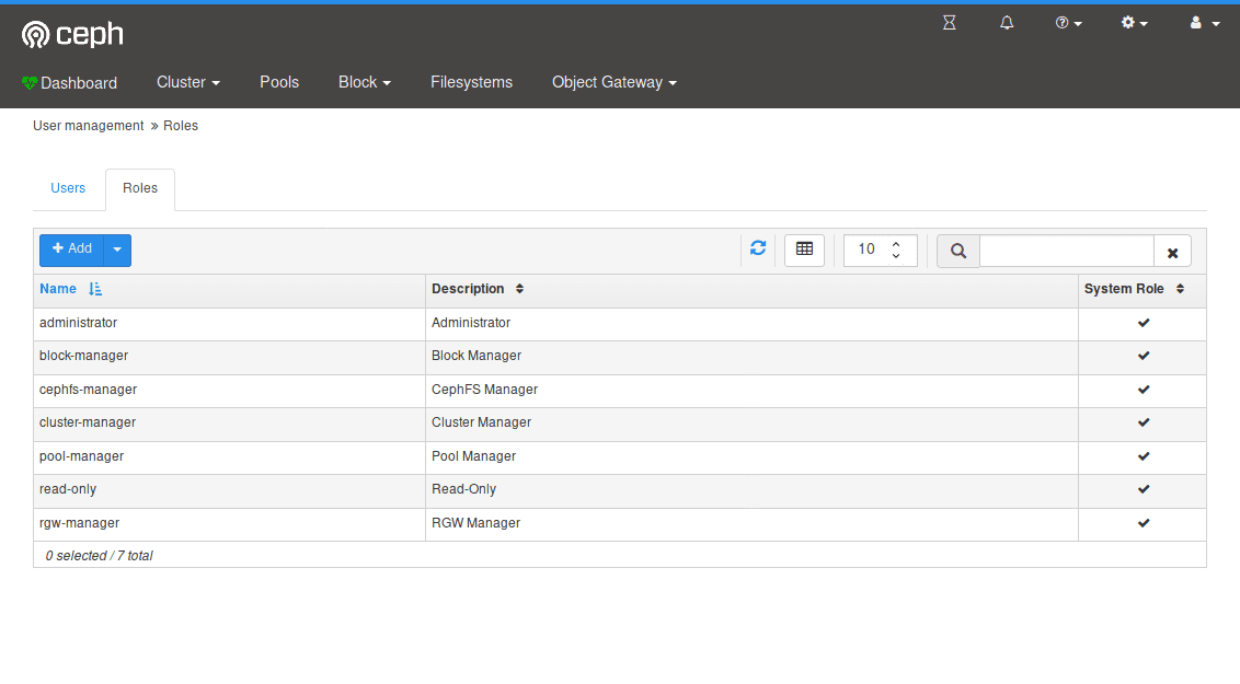 User accounts are also associated with a set of roles that define which dashboard functionality can be accessed by the user. The roles are customizable and we provide a number of pre-defined system roles, e.g. a “readonly user” that has view-only access to all aspects, or service-specific roles like an RGW admin role. This way, you can give dashboard access to users with different levels of capabilities/privileges.