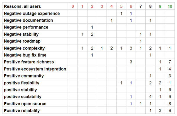 While 'reliability' and 'scalability' more frequently appeared as cause for promoter scores (a score of 9 or 10), neither good nor bad performance factored significantly into the decision.