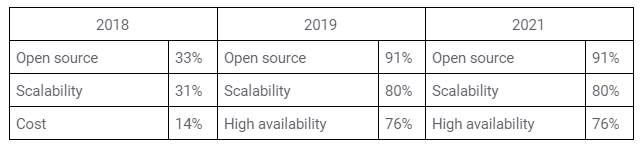 The results reveal that the value of open source and scalability have consistently remained among the top priorities, and when users are allowed to select multiple usage considerations then high availability becomes the third most important characteristic. Those usage drivers align very well with the stated core values of the project, which Sage reiterated in the recent Pacific release video.