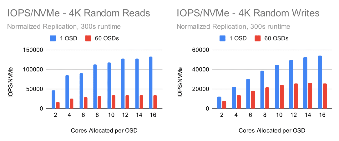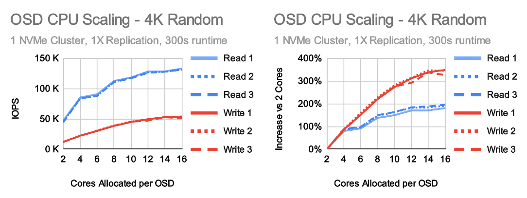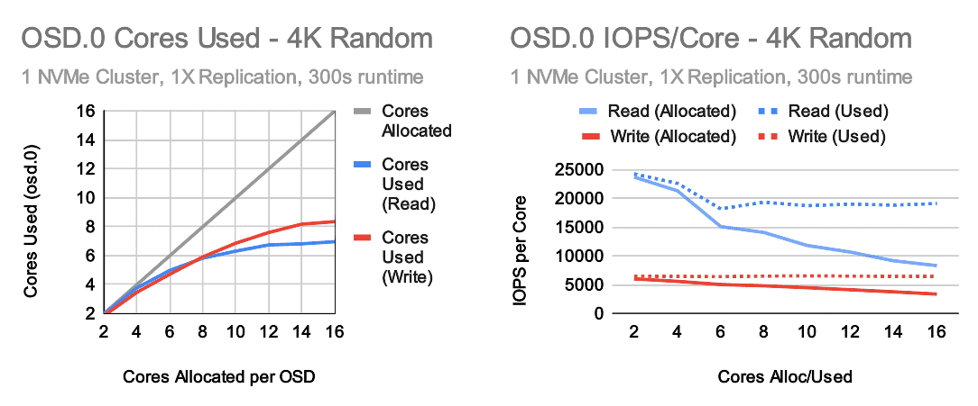 Ceph does a lot of things very well, but it's never been known to have incredibly low resource consumption. It takes work to ensure that data is consistent and placed securely where it needs to go. We have multiple efforts underway to optimize Ceph's data path, but the reality is that Ceph historically has needed quite a bit of CPU to achieve high performance on fast storage devices like NVMe drives. Earlier this summer a user approached our team with concerns about performance at low CPU core counts. They had been given a recommendation that when using NVMe drives, 2 cores should be allocated per OSD. That recommendation came with no explanation as to why. They decided to purchase hardware, though with only half of the NVMe drive bays populated (IE they had 4 cores available per OSD). The performance was acceptable in that configuration, but the user was rightly concerned about what might happen when they fully populate their servers with NVMe drives. Sadly, I had to inform them that it was likely they would only see a capacity increase and not a performance increase by adding more drives. The original recommendation wasn't entirely without merit. If a user isn't primarily concerned about the performance of small random IO, 2 cores per OSD might be a good value proposition. There are many benefits to running Ceph on NVMe drives beyond increasing small random IO performance. For this user however, small random IO was a concern and that's precisely the case when CPU resources are most important.