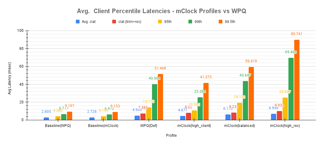 The overall average client completion latency obtained with WPQ was 4.945 msec. However, during the snaptrim phase, the average client completion latency was 7.385 msec which is an increase of over 163% when compared to the baseline value of 2.805 msec!