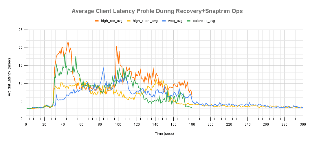 A comparison of the average client latency variations during snaptrim and recovery ops with WPQ and mClock profiles is shown during one of the test runs below. This tracks how the average client completion latency is affected at different points during background ops.