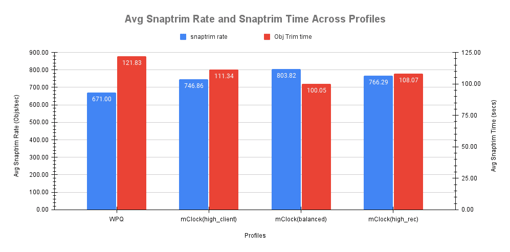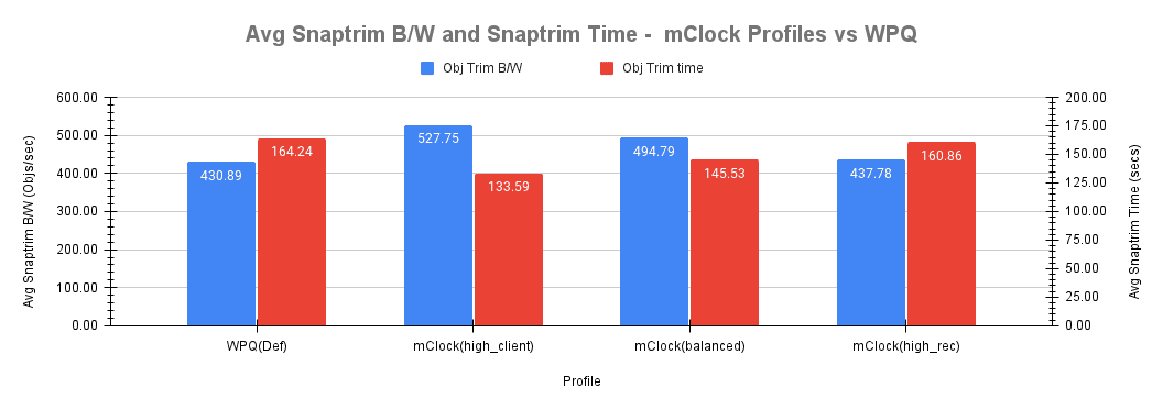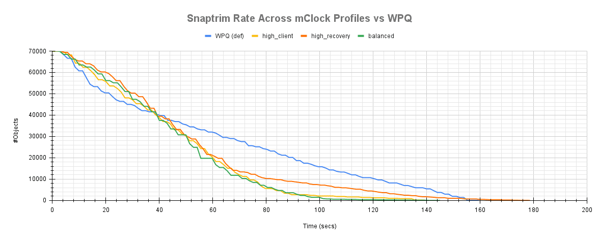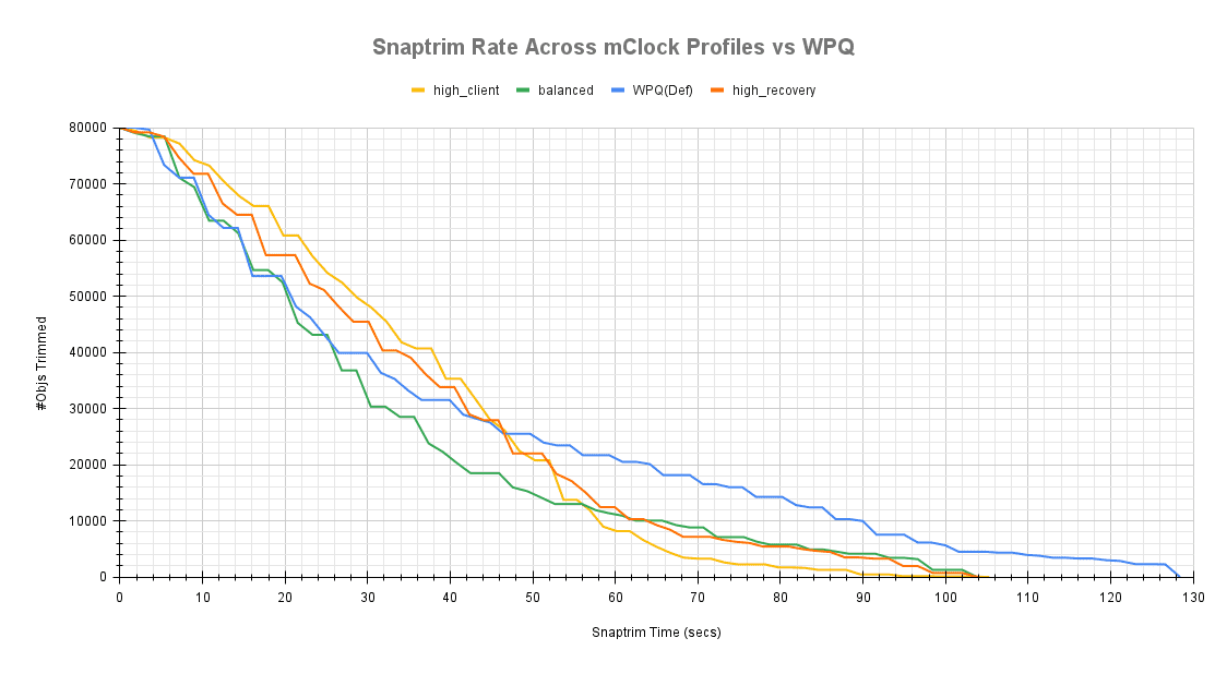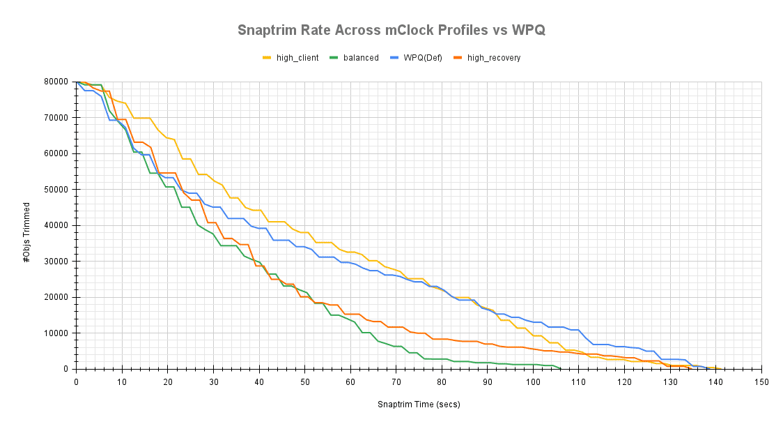 The snaptrim rate and time are affected by the mClock profiles and the charts below show how they compare against the WPQ scheduler.