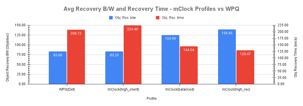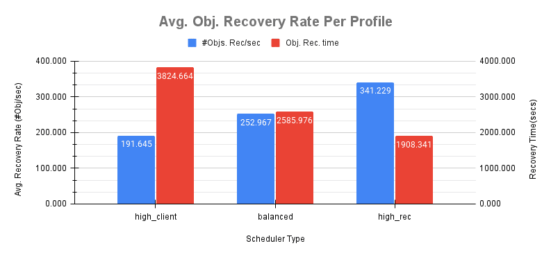 The high_recovery_ops profile as expected has the highest average recovery throughput of nearly 140 objects/sec and the lowest average recovery time of nearly 130 secs to recover around 18K objects.