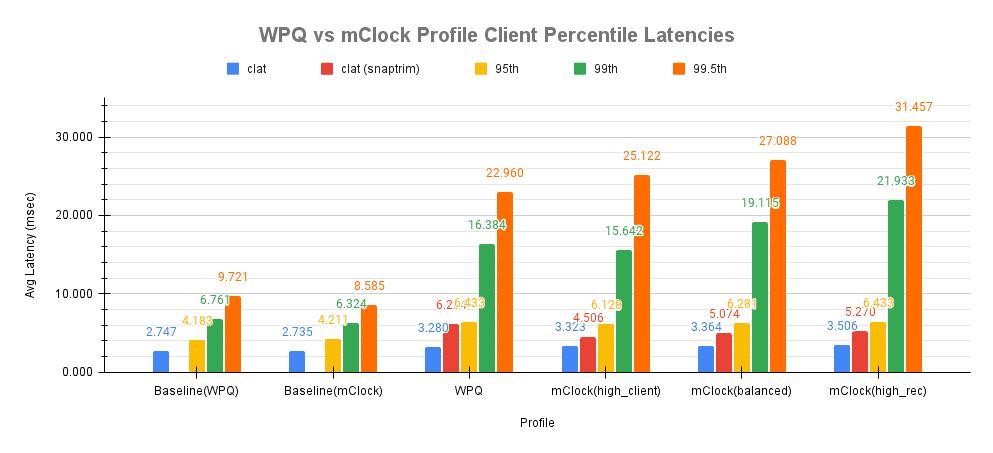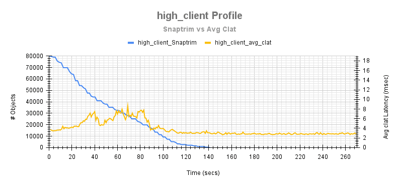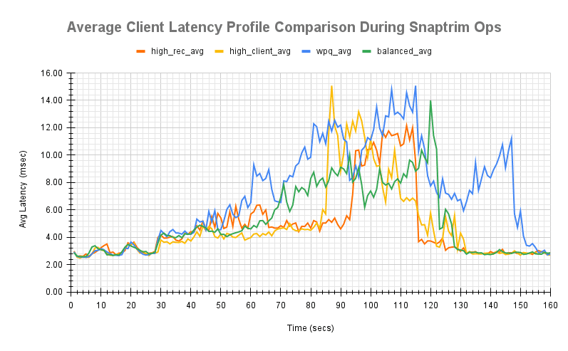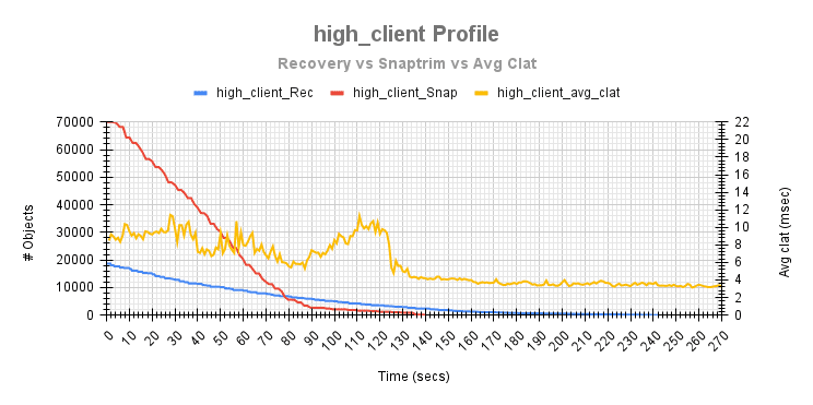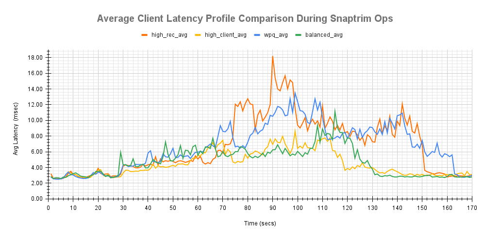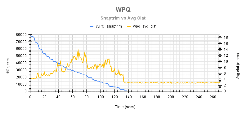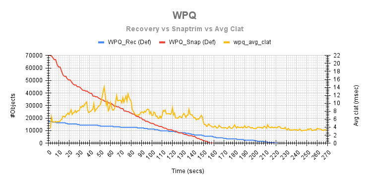 The overall average client completion latency obtained with WPQ was 3.280 msec. However, during the snaptrim phase, the average client completion latency was 6.2 msec which is an increase of nearly 126% when compared to the baseline value of 2.747 msec!