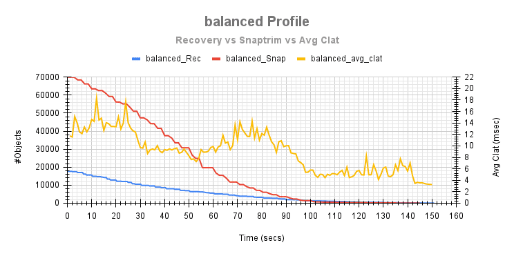 With the other mClock profiles, things are different with recoveries going on in parallel. The initial snaptrim rates with the balanced and high_recovery_ops profile are slightly slower in comparison due to the lower reservation allocation. The rate picks up marginally due to higher limit allocation and gets throttled back again towards the end and eventually completes much later than the high_client_ops profile.
