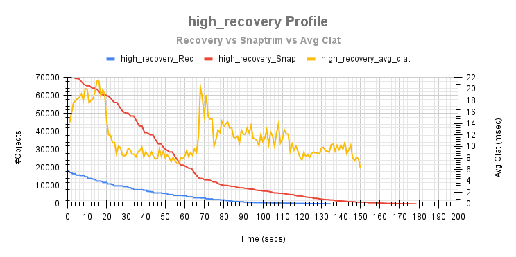 To understand the effect of snaptrim and recovery ops on client latency, the plots shown below overlays the client latency profile against the snaptrim and recovery rate during a test run.