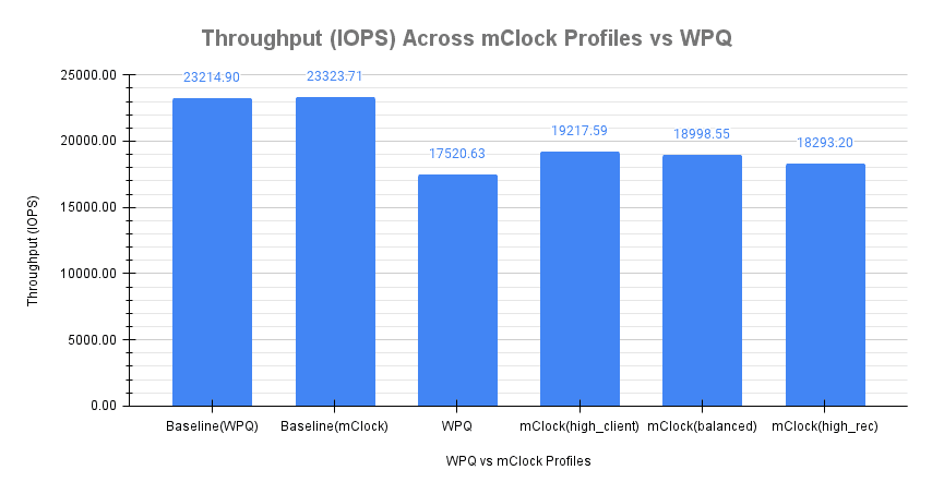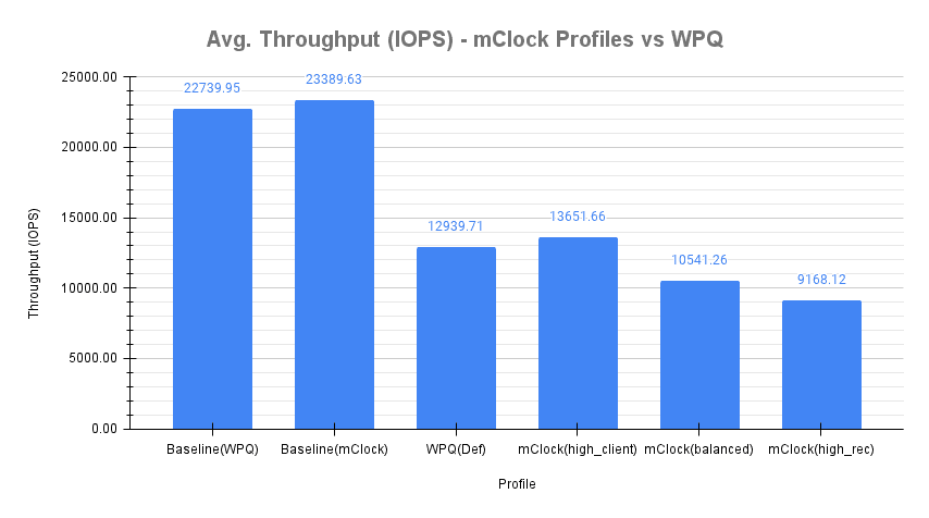 Fig. 9 shows the average client throughput comparison across the schedulers and their respective configurations. The average baseline throughput with both the schedulers was determined to be around 23K IOPS (4KiB randrw) using fio on the client RBD pool.