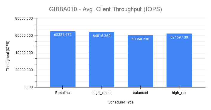The average baseline throughput was measured to be ~65326 IOPS. Fig. 20 below shows the average client throughput comparison across mClock profiles during a test run on the client node Gibba010.