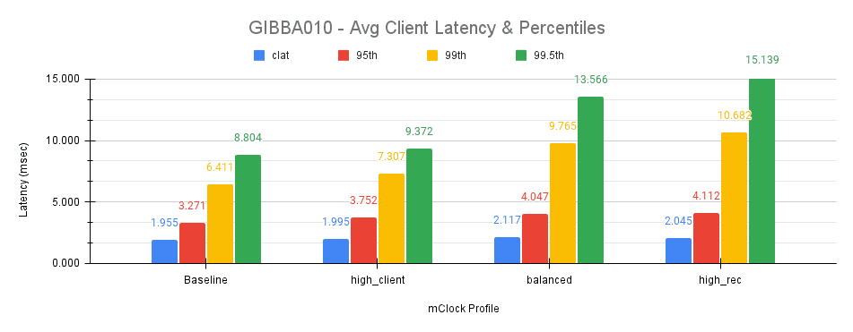 The raw throughput capacity of an OSD was determined to be around 60K IOPS (4KiB randrw). To mitigate memory saturation and its aftereffects on the OSD nodes when clients were performing at max throttle, the osd_mclock_max_capacity_iops_ssd for each OSD was set to ~50% of the raw throughput i.e. 30K IOPS. The results from one of the clients nodes (Gibba010) is discussed below.