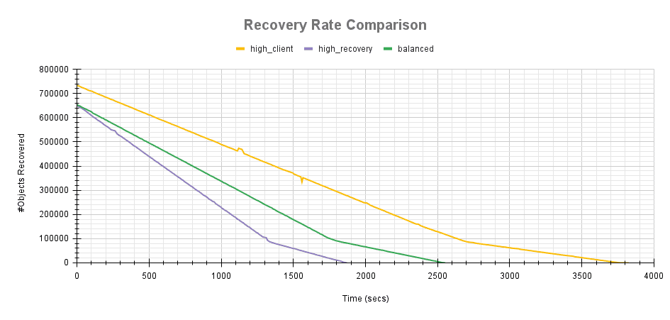 The charts in this section compares the recovery rates across the mClock profiles. From the bar chart in Fig. 22, the high_client_ops profile shows the lowest recovery rate of ~192 Objects/sec and the highest recovery time of ~3825 secs to recover ~730K objects. This is followed by the balanced profile with a recovery rate of ~253 Objects/sec and a recovery time of ~2586 secs (32% lower) to recover ~650K objects. The high_recovery_ops profile provides the best recovery performance with a rate of ~341 Objects/sec and the lowest recovery time of ~1908 secs to recover ~650K objects. This is over 50% faster than the high_client_ops profile and with only a marginal 4.6% increase in the client completion latency. This underscores the effectiveness of mClock to provide the desired level of QoS under heavy recovery load.