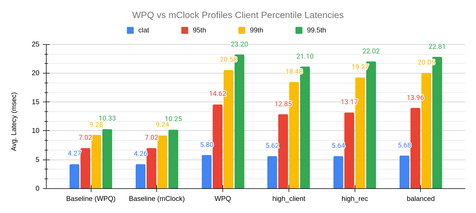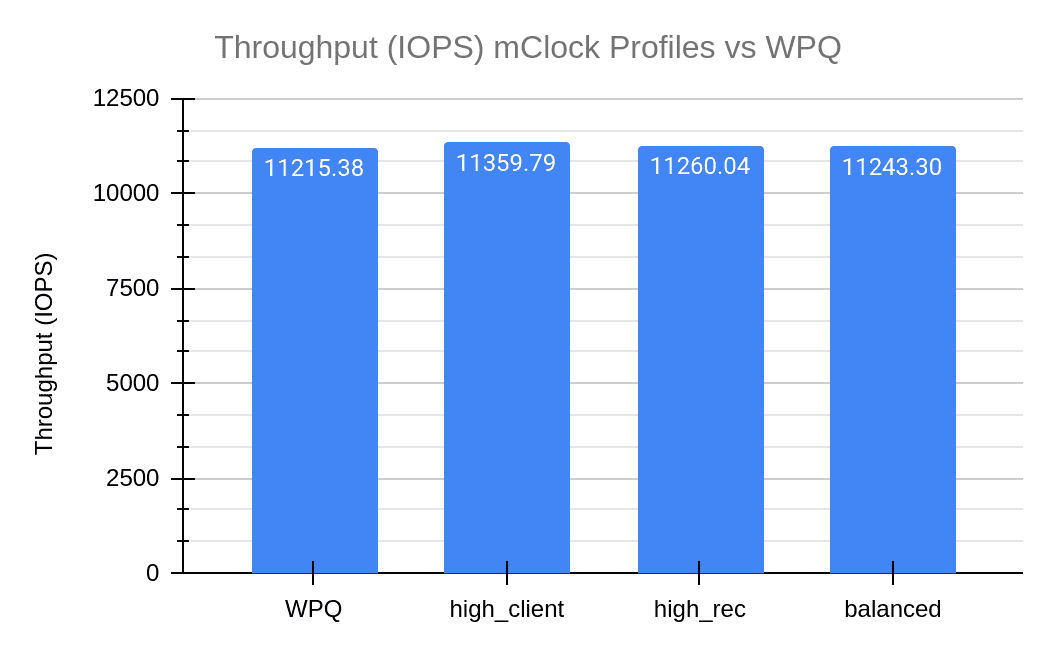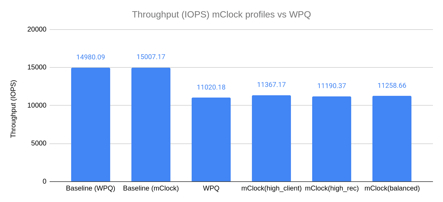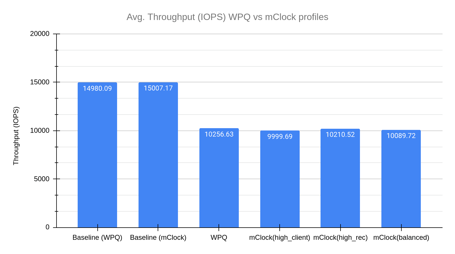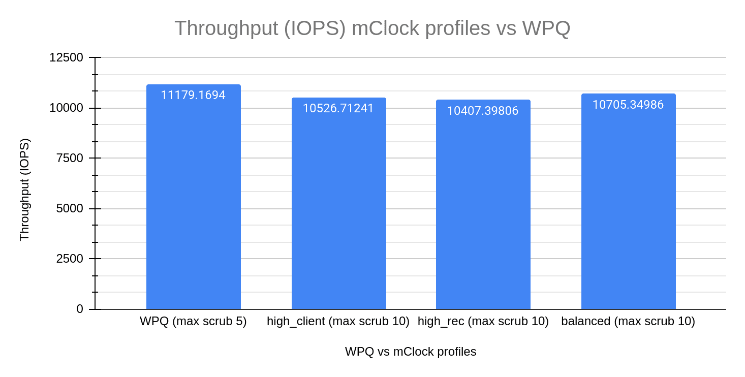These results help us make the inference that average client throughput is higher with the mClock profiles than with WPQ. mClock is able to provide the desired QoS for client operations with background scrub operations running concurrently.