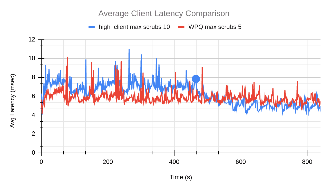The blue dot in the graph above indicates the point at which scrub finished for the high client profile test with max scrubs set to 10.