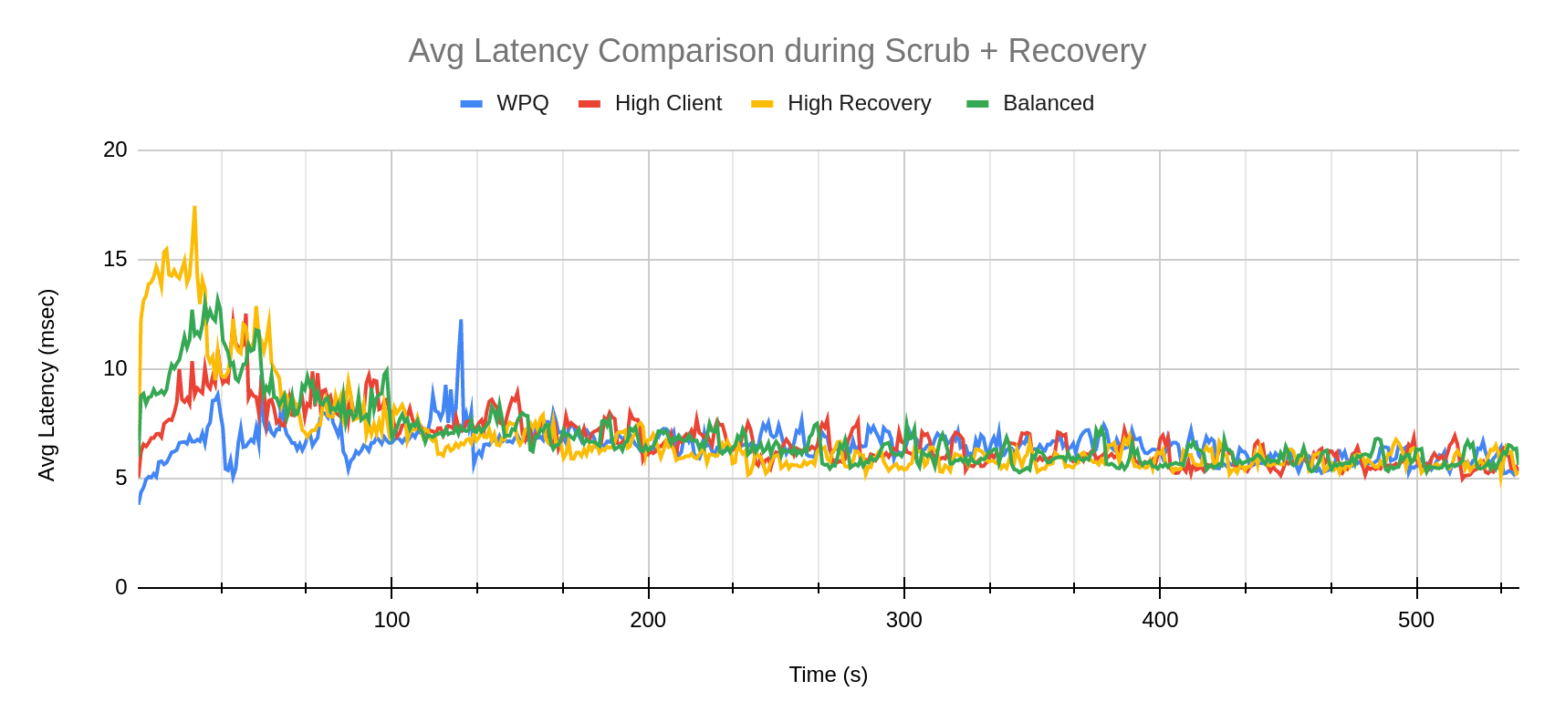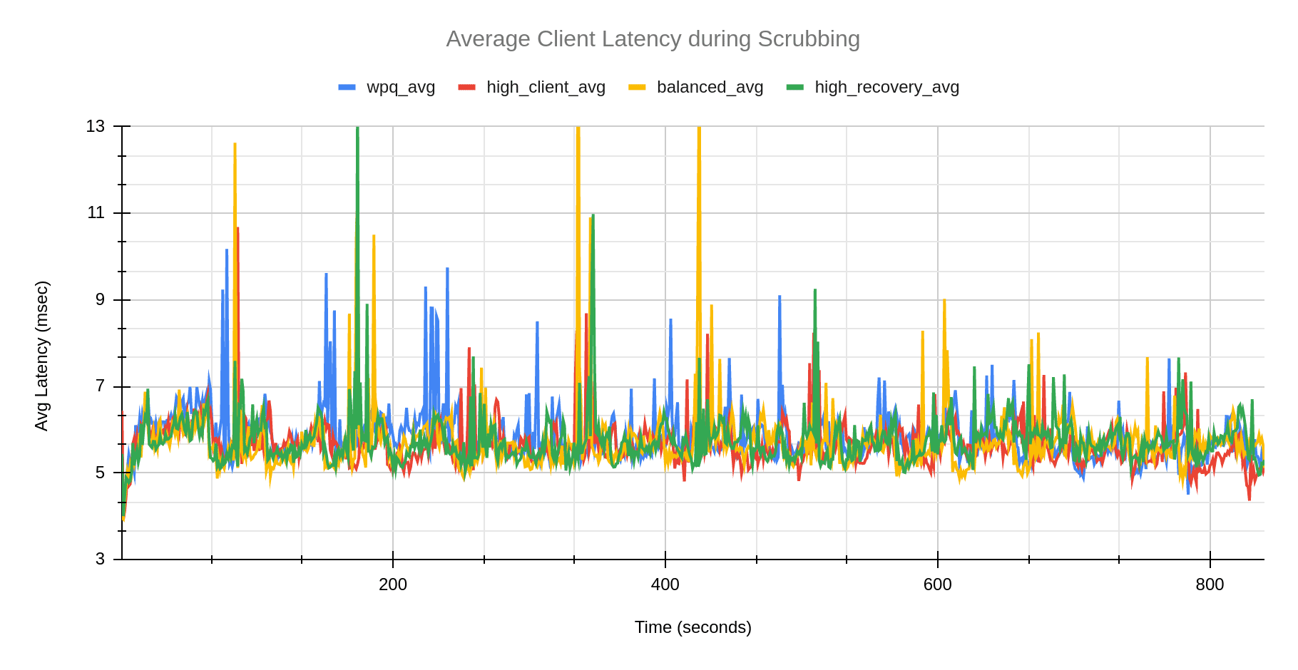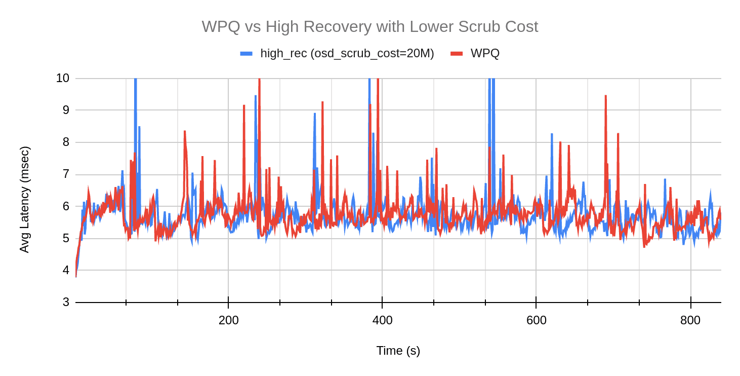 A comparison between the average client latency of high client profile (osd max scrubs = 10) and WPQ shows us the increase in latency while scrub is in progress.