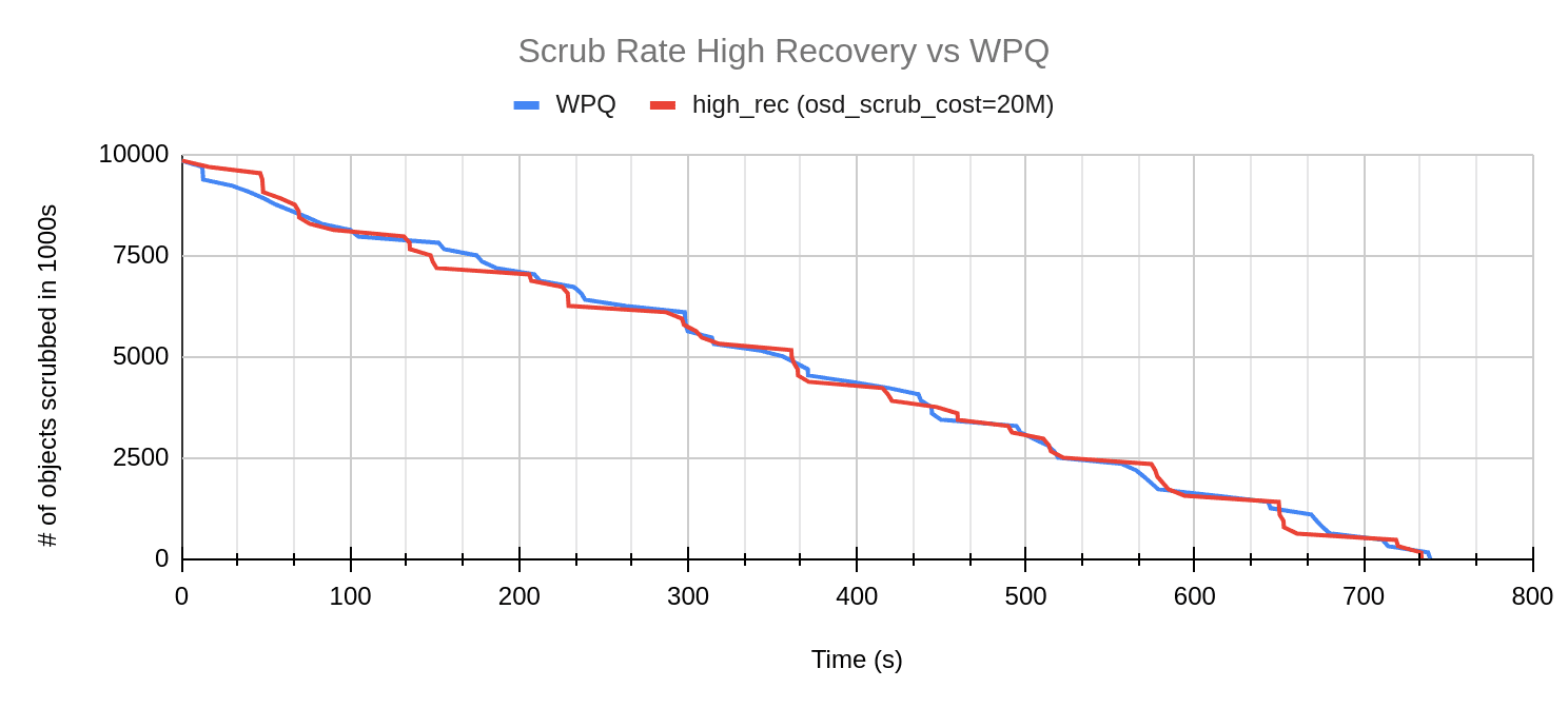 The graphs below show the scrub and recovery rate over the duration of the test. In the scrub rate comparison, mClock profiles take some time to start scrub whereas with WPQ we can see that scrub starts almost immediately.