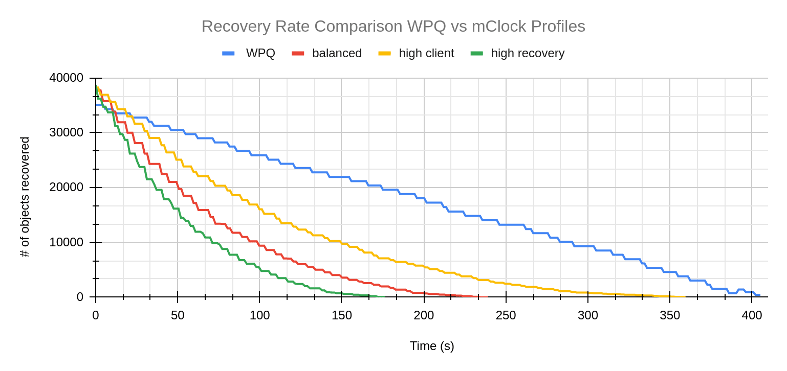 Almost the opposite trend can be observed in the graph comparing recovery rates. The number of objects recovered starts decreasing rapidly for all the mClock profiles. WPQ seems to have a slow start and eventually takes much longer to complete recovery than the mClock profiles.
