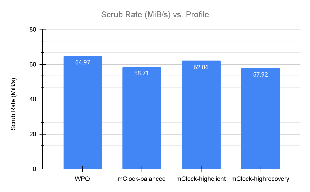 To summarize, after taking a look at how the default mClock profiles handle background operations such as scrubbing and recovery, we can say that mClock profiles attempt to finish recovery faster than a scrub. In addition to this, the experiments with the mClock custom profile proved that with higher allocations, we can achieve a faster scrub. Other than mClock parameters, we also explored the existing Ceph configuration parameters that can be tuned to give us better scrub performance with mClock. The mClock scheduler is the default osd_op_queue in the Quincy release. Let us know how your experience with mClock goes, and thank you for reading! For any queries please do reach out to ceph-users@ceph.io.