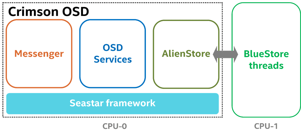 Ceph OSD is a part of Ceph cluster responsible for providing object access over the network, maintaining redundancy and high availability and persisting objects to a local storage device. As a rewritten version of the Classic OSD, the Crimson OSD is compatible with the existing RADOS protocol from the perspective of clients and other OSDs, providing the same set of interfaces and features. Ceph OSD modularity such as Messenger, OSD services, and ObjectStore are unchanged in their responsibilities, but the form of cross-component interactions and internal resource management are vastly refactored to apply the shared-nothing design and user-space task scheduling bottom up.