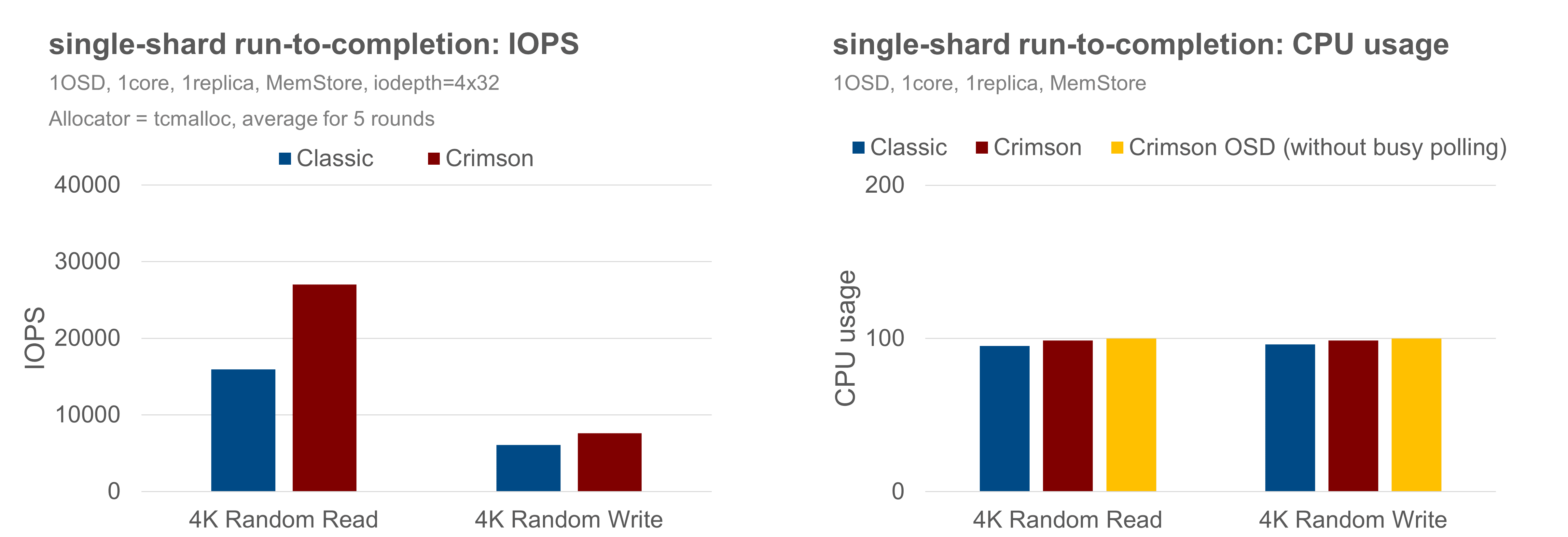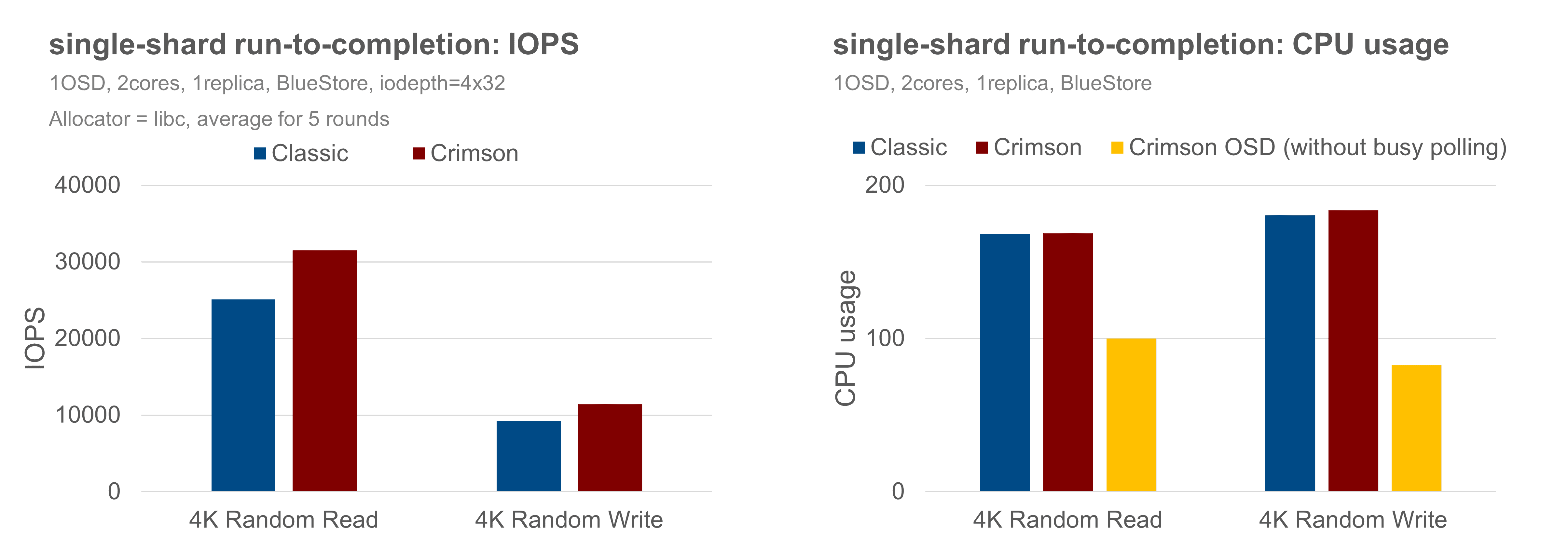 Considering fairness and reality, the single-shard run-to-completion is validated by comparing Classic and Crimson OSD with the BlueStore backend, under the same random 4KB RBD workload, and without replication. Both OSDs are assigned 2 CPU resources. The Crimson OSD is special because Seastar requires an exclusive core to run the single-shard OSD logic in the reactor. It implies that the BlueStore threads must be pinned to the other core, with AlienStore introduced to bridge the boundary between the Seastar thread and BlueStore threads and to submit IO tasks between the two worlds. In contrast, the Classic OSD has no restrictions to use the assigned 2 CPUs.