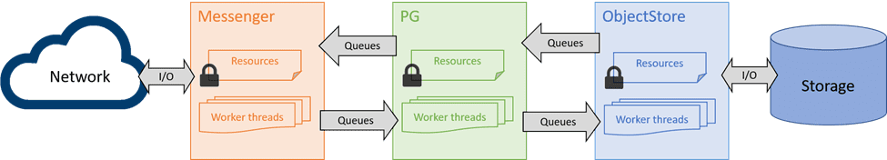 A major challenge of the Classic architecture is that lock contention overhead scales rapidly with the number of tasks and cores, and every locking point may become the scaling bottleneck under certain scenarios. Moreover, these locks and queues incur latency costs even when uncontended. There have been considerable efforts over the years on profiling and optimizations for finer-grained resource management and fast path implementations to skip queueing. There will be less low-hanging fruits in the future and the scalability seems to be converging into a certain multiplicator under a similar design. There are other challenges as well. The latency issue will deteriorate with thread pools and task queues, as the bookkeeping effort delegates tasks between the worker threads. And locks can force context-switches which make things even worse.