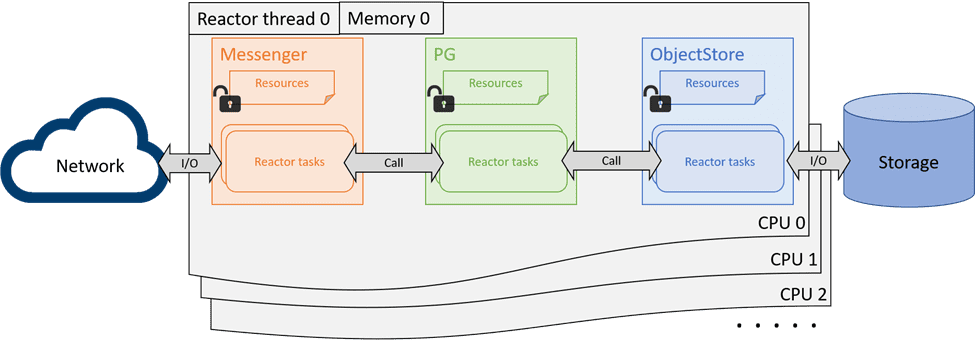 Seastar3 is ideal for the Crimson project because it not only implements the one-thread-per-core shared-nothing infrastructure in C++, but also provides a comprehensive set of features and models that have been proven to be effective for performance and scaling in other applications. Resources are by-default not shared between shards, and Seastar implements its own memory allocator for lockless allocations. The allocator also takes advantage of the NUMA topology to assign the closest memory to the shard. For some inevitable cross-core resource sharing and communications, Seastar enforces them to be handled explicitly: If a shard owns resources from another core, it must hold them by foreign pointers; And if a shard needs to communicate with other shards, it must submit and forward the tasks to them. This forces the programmers to restrain their needs to go cross-core and helps to reduce the analysis scope for the CPU scalability issues. Seastar also implements high-performance non-blocking primitives for the inevitable cross-core communications.