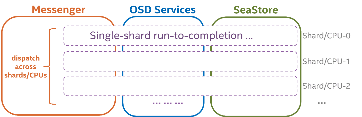 Although cross-shard communications cannot be eliminated entirely, those are usually for OSD global status maintenance and not in the data path. A major challenge here is that the expected changes are fundamental to core OSD operation – a considerable part of the existing locking or threading code cannot be reused, and needs to be redesigned while backward compatibility is maintained. Redesign requires holistic understanding of the code with inherent caveats. It is another challenge to implement low-level thread-per-core and user-space scheduling using shared-nothing architecture. Crimson seeks to build the redesigned OSD based on Seastar, an asynchronous programming framework with all the ideal characteristics to meet the above goals.