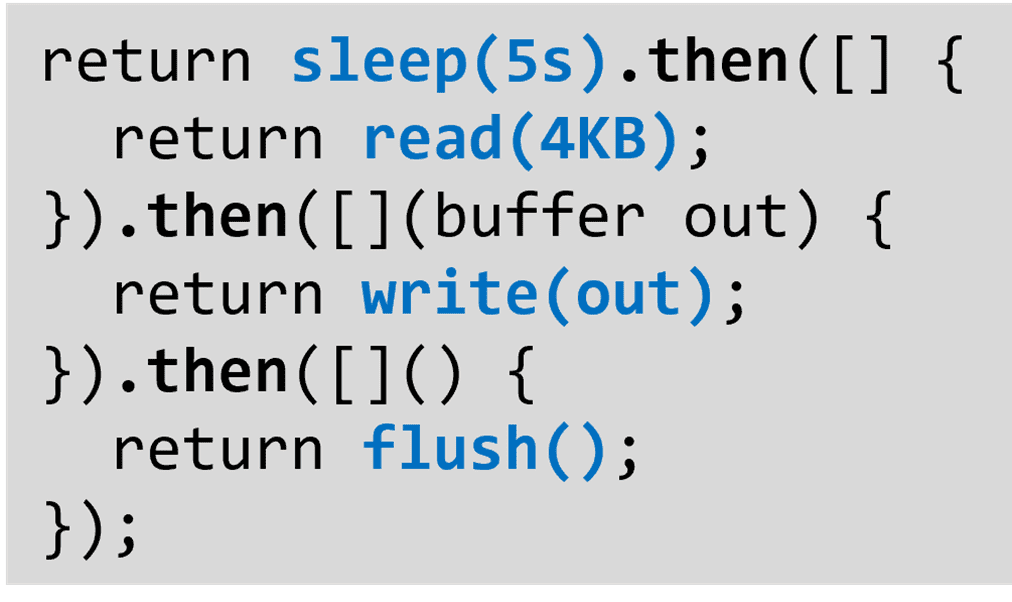 The conventional program with asynchronous events and callbacks is notoriously challenging to implement, understand and debug. And non-blocking task scheduling in user space requires implementation to be pervasively asynchronous. Seastar implements the futures, promises and continuations (f/p/c) as the building blocks to organize the logic. The futures and promises makes code easier to write and read by grouping logically connected, asynchronous constructs together, rather than scattering them in plain callbacks. Seastar also provides higher level facilities for loops, timers, and to control lifecycles and even CPU shares based on the futures. To further simplify applications, Seastar encapsulates both networking and disk accesses to the world of shared-nothing and f/p/c-based design. The complexity and nuanced control to adopt different I/O stacks (such as epoll, linux-aio, io-uring, DPDK, etc) are transparent to the application code.
