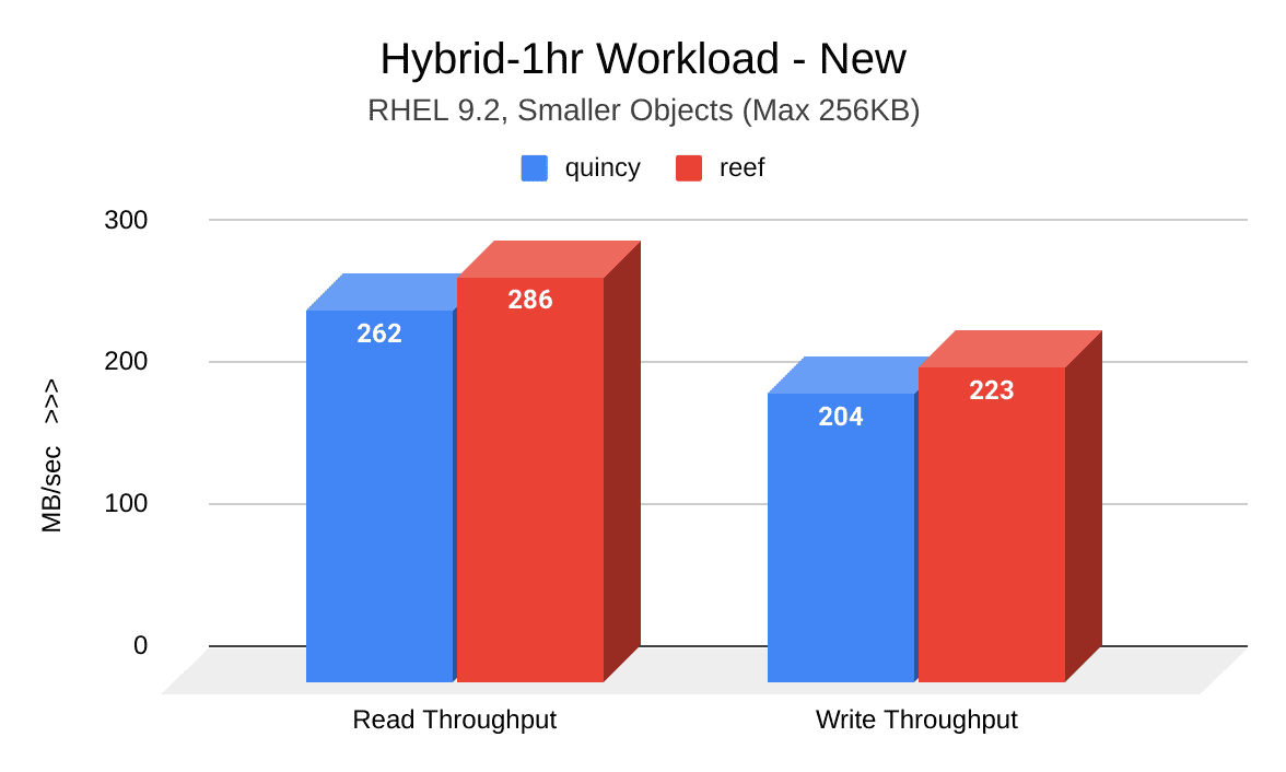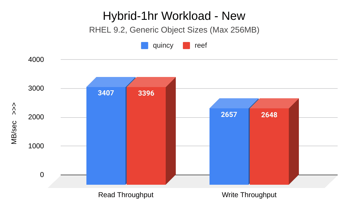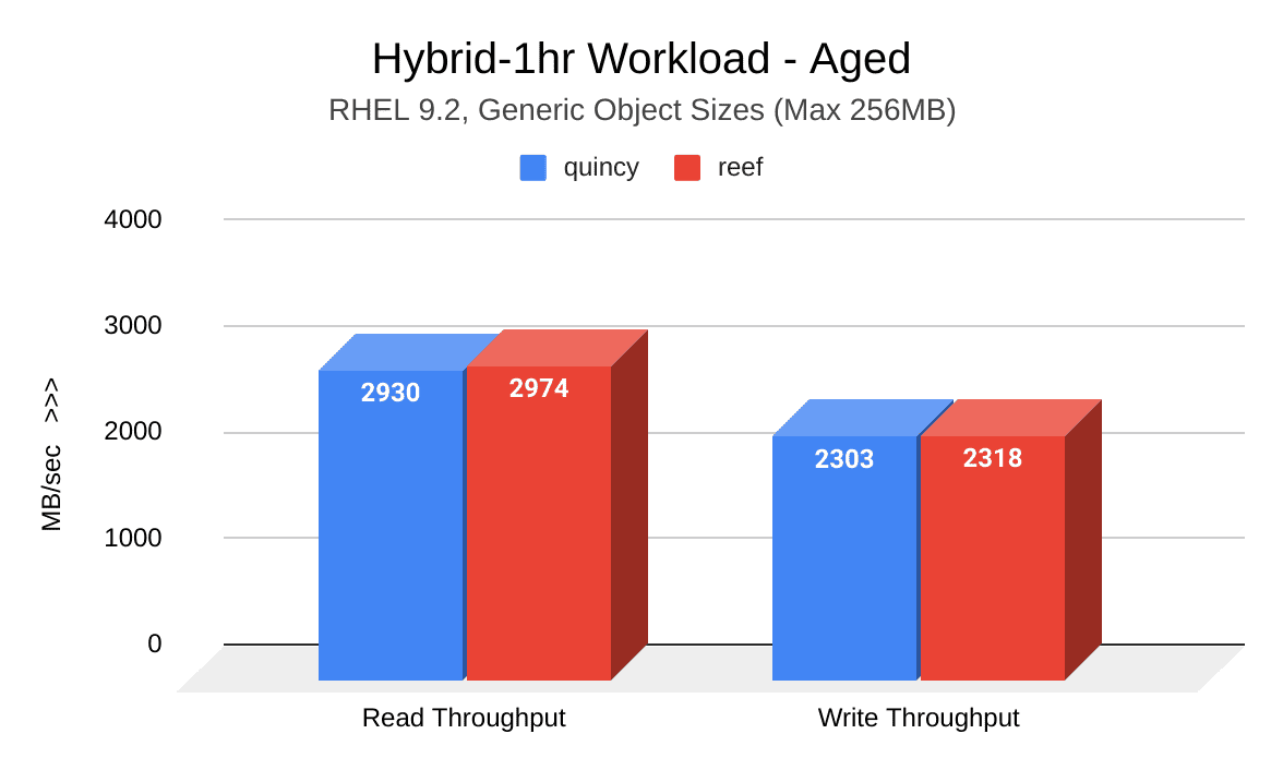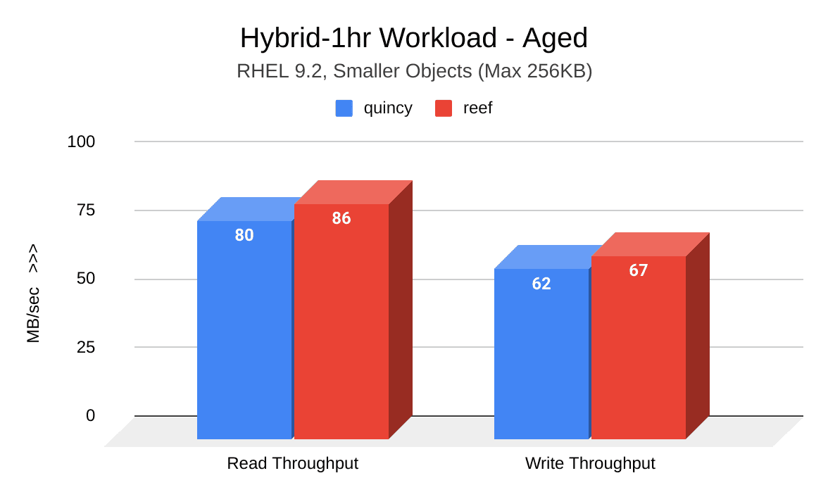 The cluster fill and aging workloads performed in this test cycle revealed significantly improved throughput results in Reef.