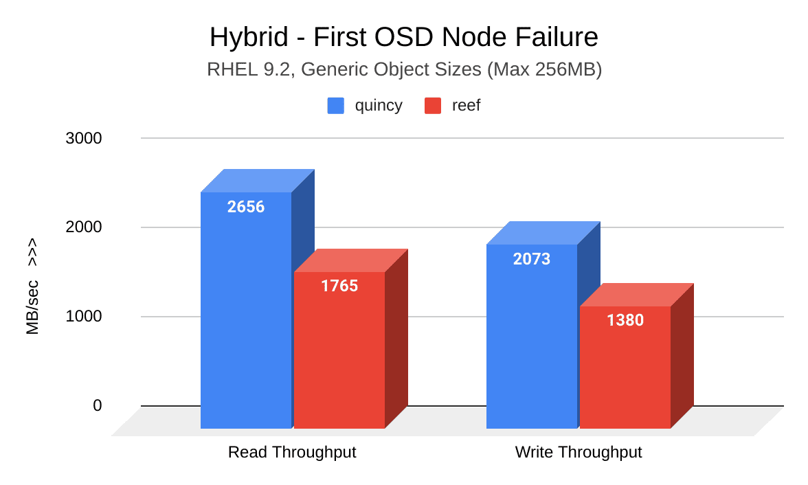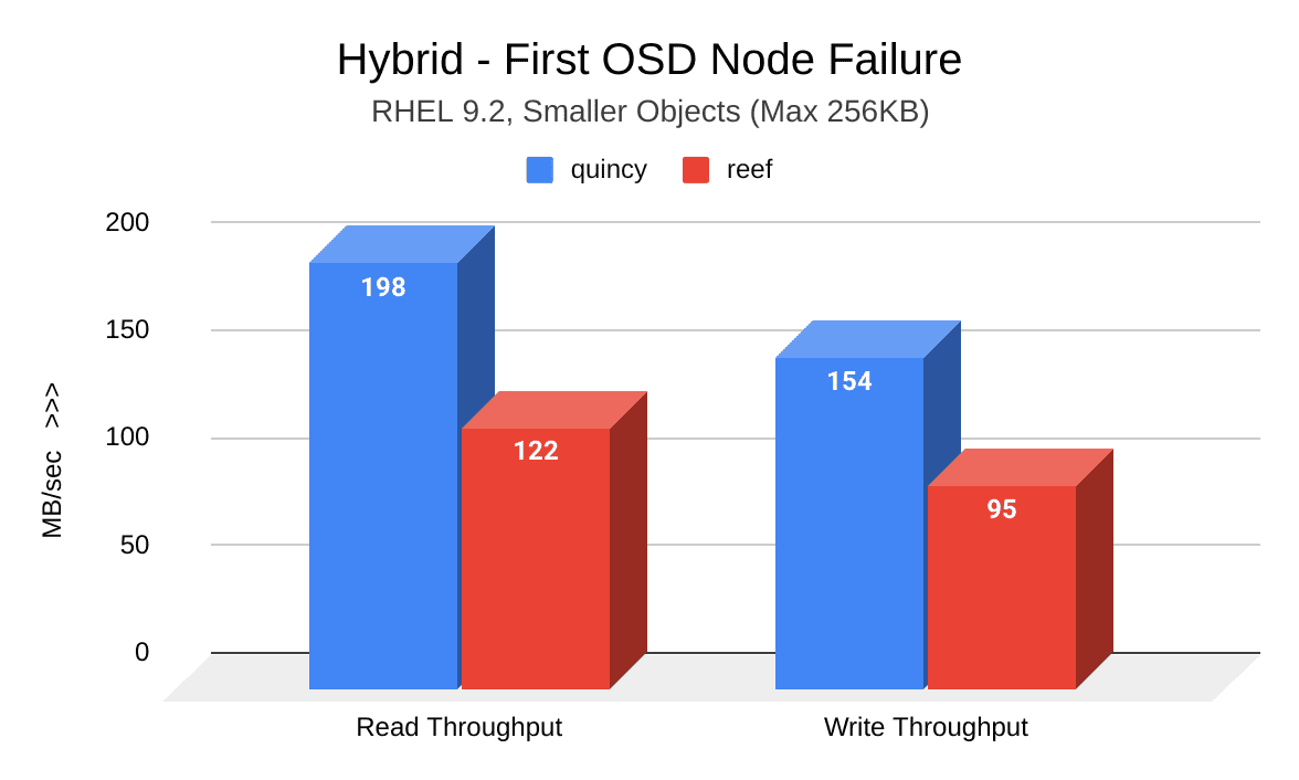 Overall, upgrading to Reef means significant throughput improvements in most cases, especially for small object workloads. Although throughput may decrease during OSD failure scenarios, recovery time is much quicker in Reef compared to Quincy, particularly for small object workloads.