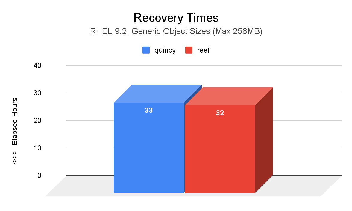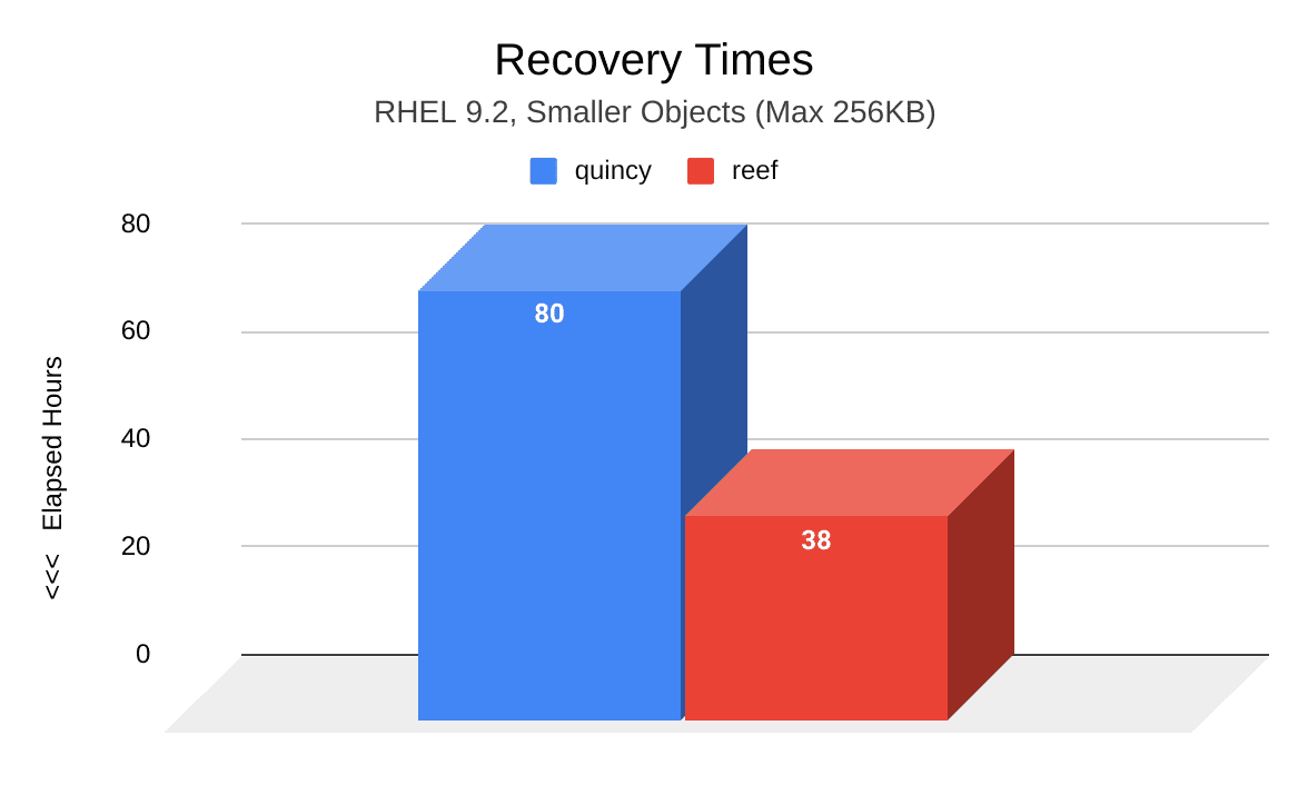 The following image shows a comparison of recovery time (hours) between Quincy (blue) and Reef (red) after two induced OSD node failures. Compared to Quincy, PGs in Reef took significantly less time to reach an active+clean state. At a total of 38 hours, Reef’s recovery time took 42 less hours than Quincy’s recovery time of 80 hours.