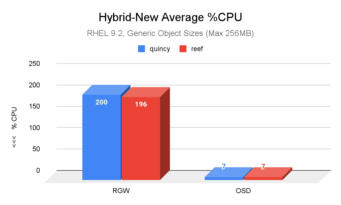 The most notable difference is shown in the following image, which is a comparison of average percent CPU usage between Quincy (blue) and Reef (red) in a new cluster with generic object sizes. Reef’s RGW CPU usage showed a slight improvement compared to Quincy’s.