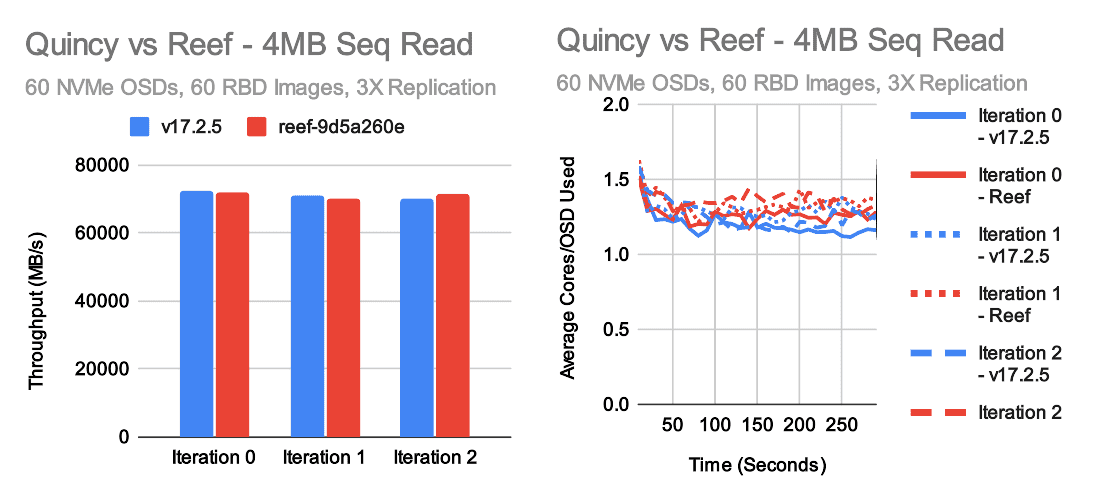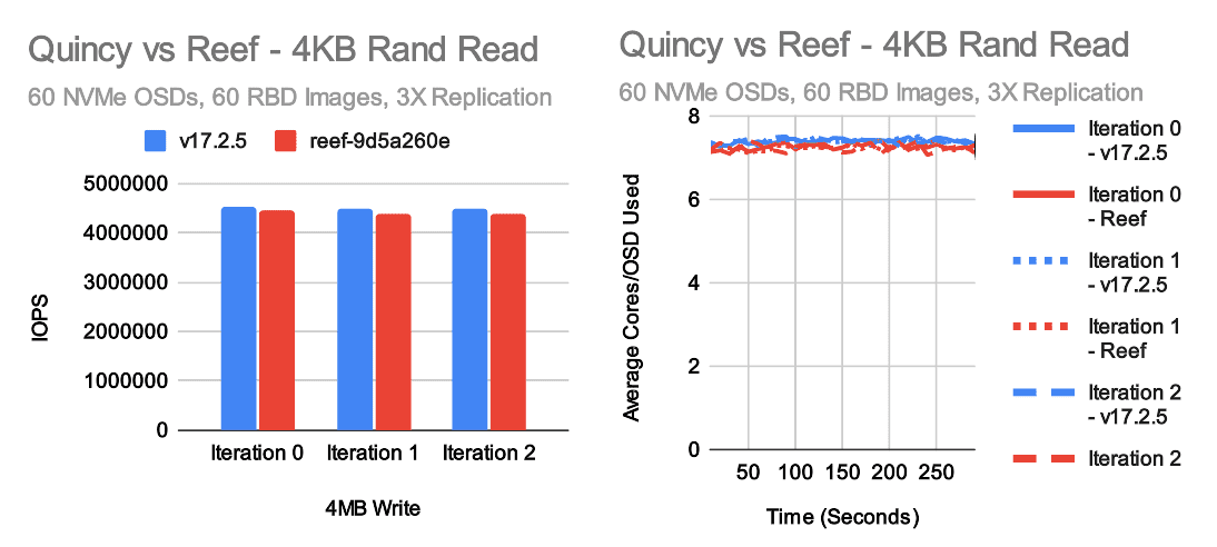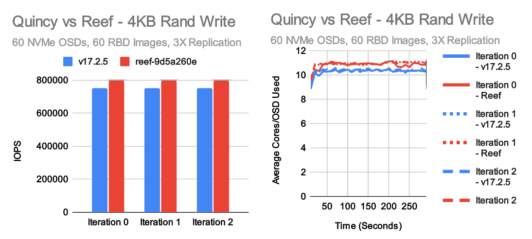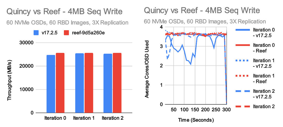 On anything larger than a single-OSD clusters, Ceph places data determinsitically in a pseudo-random fashion using crush. While high PG counts and/or PG balancing can help improve this, there are always going to be temporal hotspots and some OSDs enevitably take longer to do their work than others. Aggregate, long term cluster performance is thus often limited by the slowest or most heavily utilized OSD at any given point in time. This is a lesson that every Ceph operator learns and periodically relearns, myself included. Why am I bringing this up now? After the Reef freeze I resurrected the CBT configuration I had used for Quincy testing and got to running a new set of tests. The initial results looked pretty good. Quincy performance was a little lower than expected, but not too far off from what we saw previously. Once I got to Reef though, the results started to look a little unexpected.