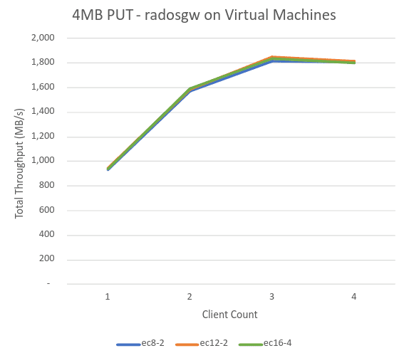 Given that PUT workloads are generally more demanding, we used a simple 4MB object workload as a litmus test. The chart below, shows our initial disappointing results. Failing to even deliver 2GiBs throughput shows that there was a major bottleneck in the design!