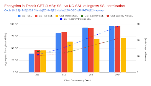To evaluate the impact of TLS on Ceph Object Gateway (RGW) S3 endpoint performance, we compared three common deployment strategies: end-to-end encryption (SSL at RGW), SSL termination at the cephadm-deployed ingress service (HAProxy), and an unencrypted baseline. The HAproxy services run collocated with the Ceph Object Gateway (RGW) services. There is a virtual IP address (VIP) configured per node, and the benchmark clients balance requests across all VIPs configured. These tests were performed on a twelve-node cluster using EC 8+3 with both mid/large (4 MiB) and small (64 KiB) object workloads.